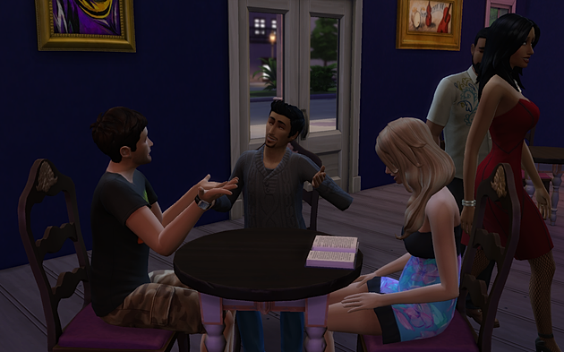 I’m just chillin at the Blue Velvet with Stephon and Harper. It looks like these two love birds are really making it happen! They were already here before I arrived. It looks like it’s gonna be a pretty sweet night of drinking and fun because friggin everyone’s here! It’s me, Stephon, Harper, and I see Bob, Gilbert, and even that Bella chick I met a while ago. It’s too bad Genevieve wasn’t working tonight. That Vivian chick is running the bar this evening.